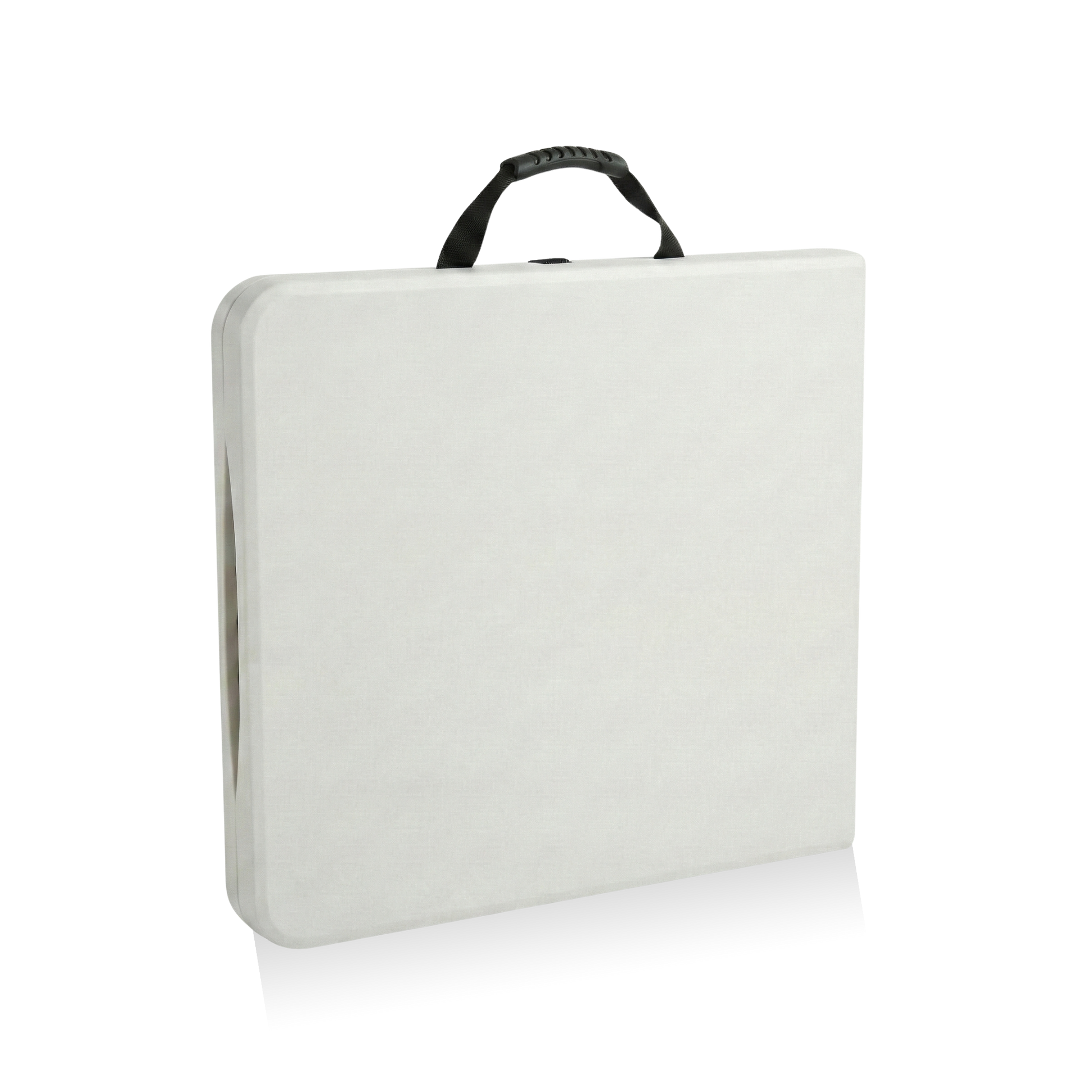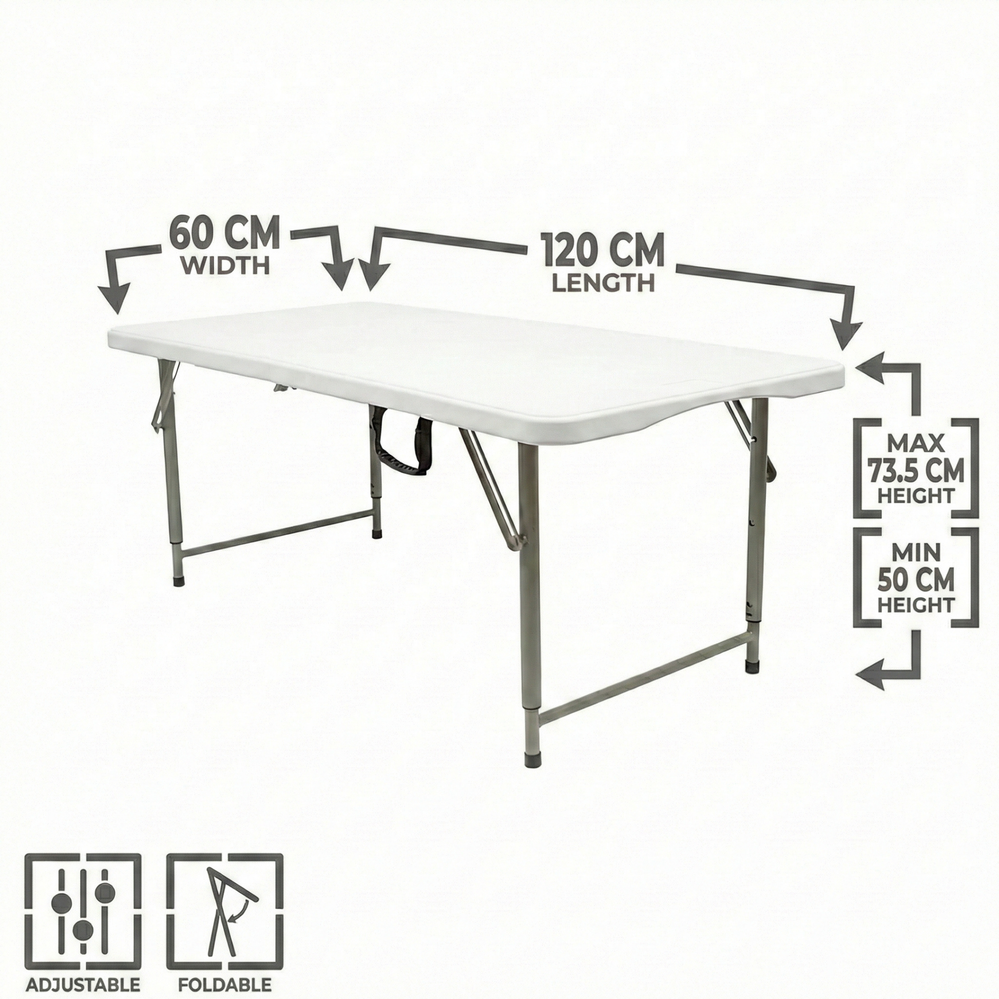 A utility table designed for durability and compact storage. The 120x60cm polyethylene top is waterproof, stain-resistant, and impact-resistant. Steel legs fold completely flat under the table.