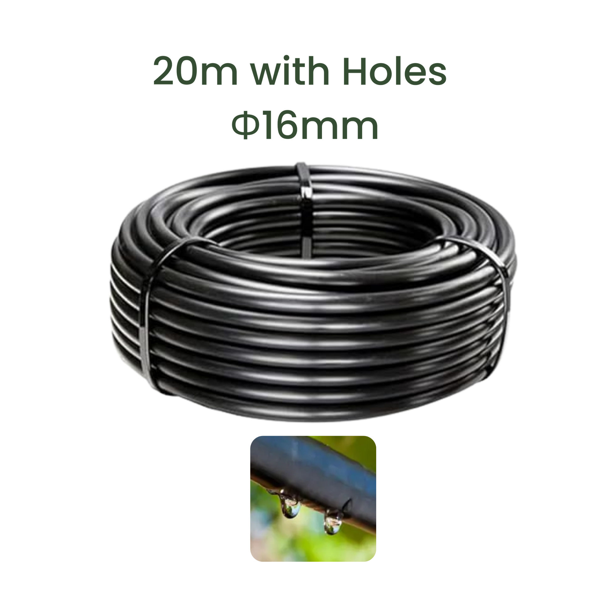 20-meter PVC drip hose pre-punched with evenly spaced holes. Designed for direct use with 16mm irrigation fittings.