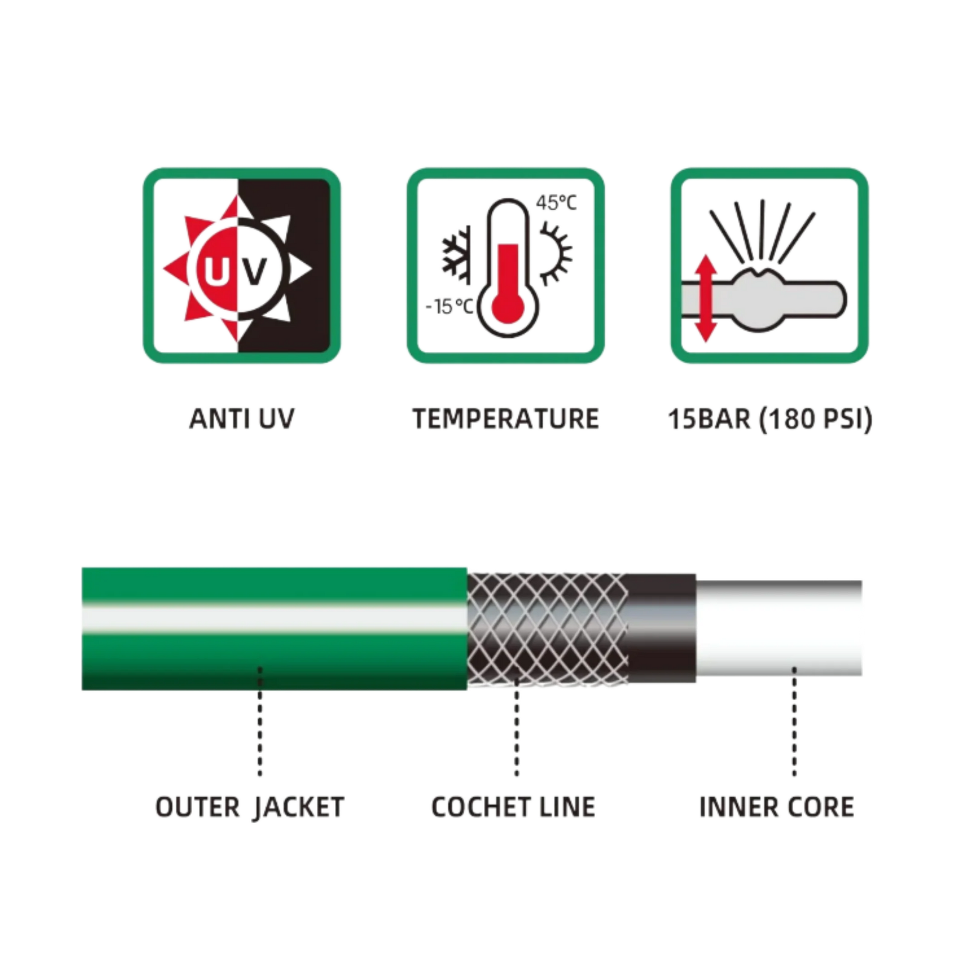 Complete 20m Reach: Includes a 20-meter 1/2" 3-ply PVC hose, engineered to resist kinking and withstand high water pressure.