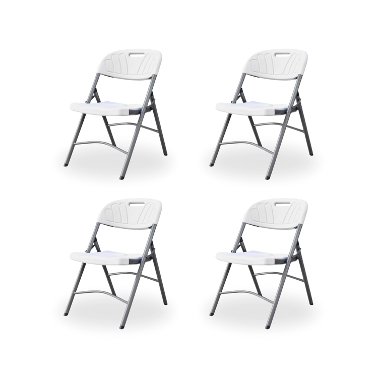 A bundle of four steel-frame folding chairs. Identical to the single unit, sold as a set for instant seating capacity.