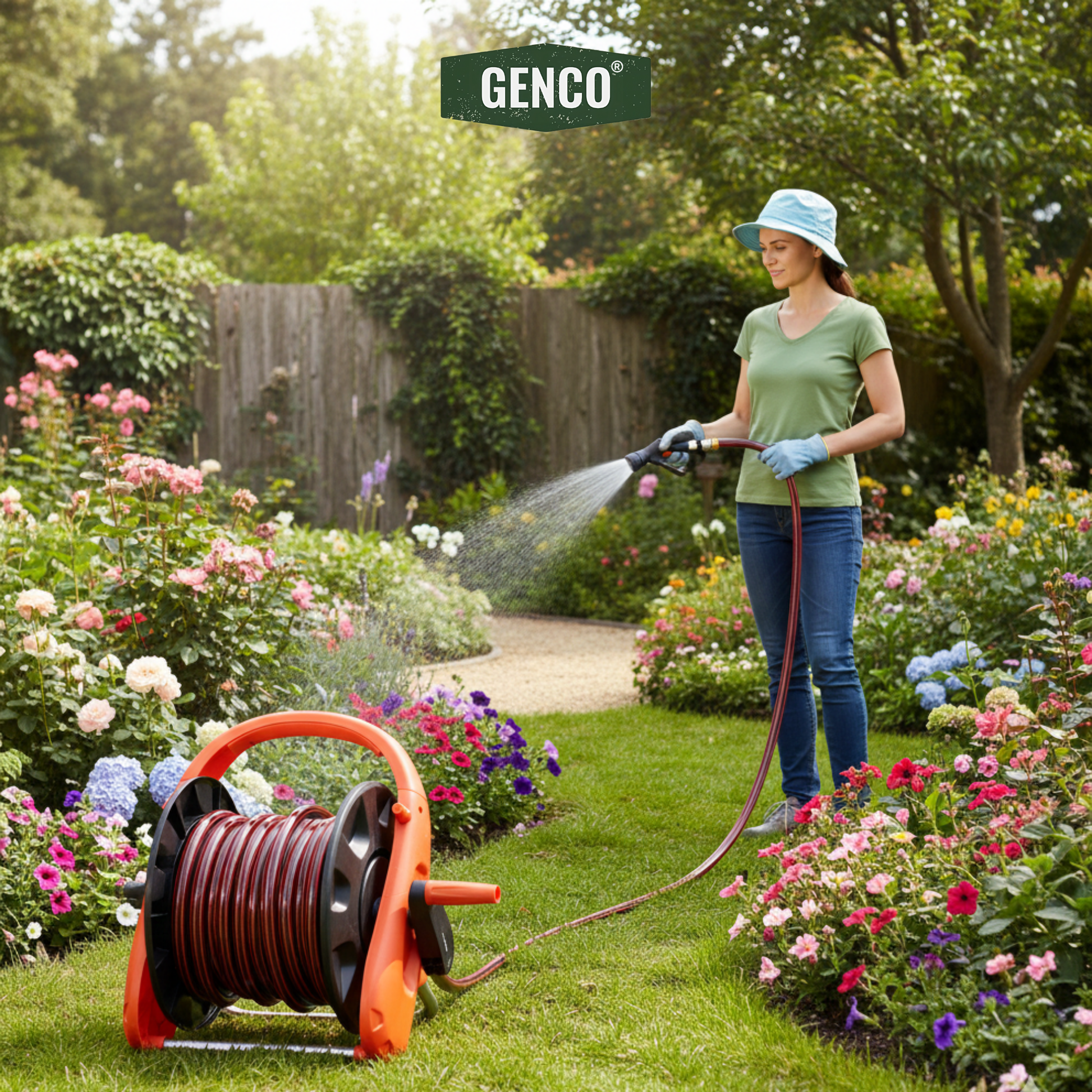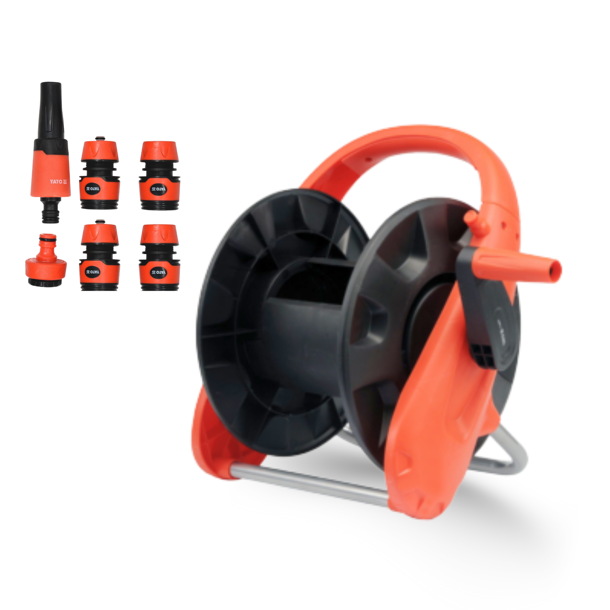 This is a stationary manual hose reel designed to store up to 30 meters of standard 1/2-inch garden hose. Please note: The hose is not included; this is the reel unit only. It features a red and black frame with a side hand crank for manual winding. It does not have wheels and is intended to be placed in a fixed location.