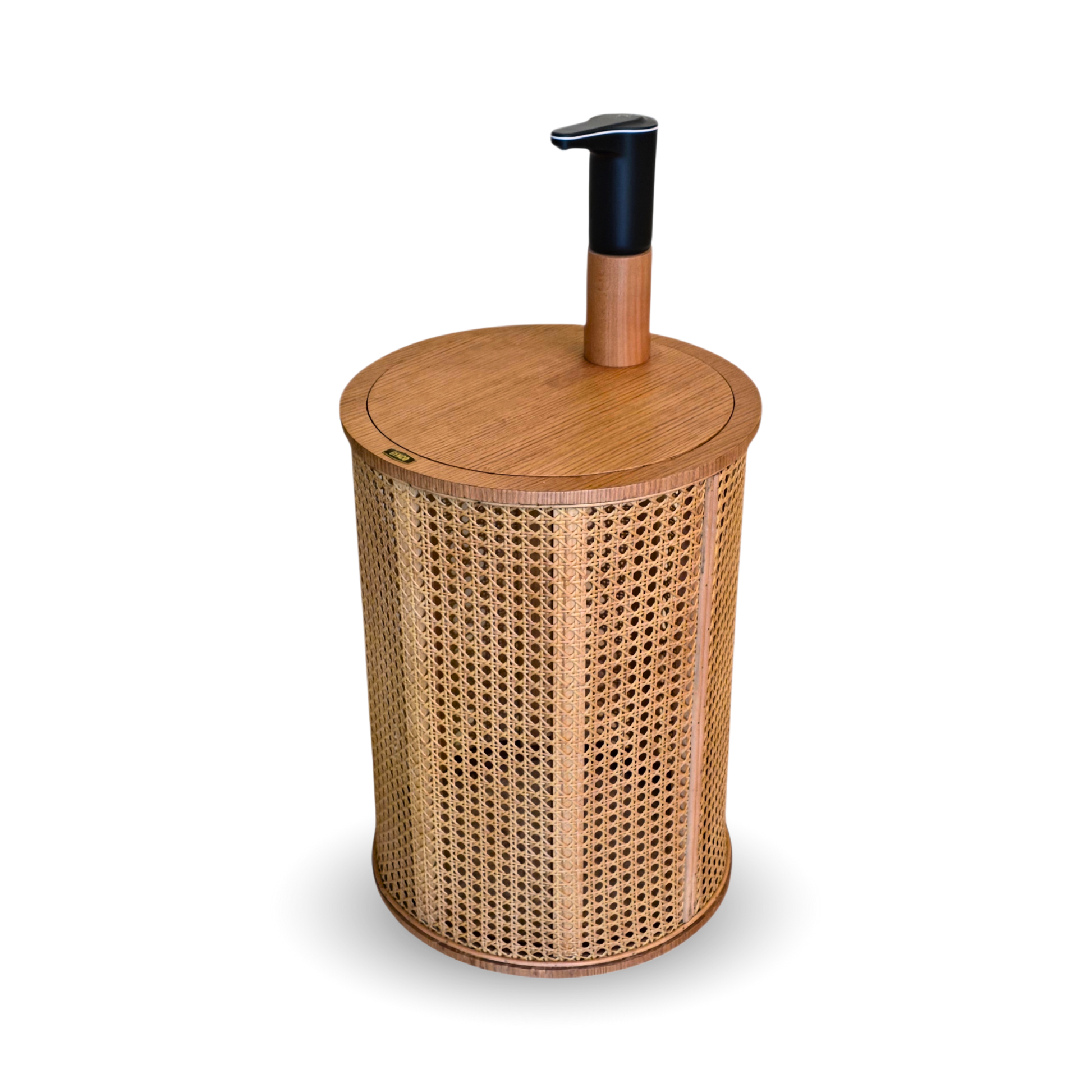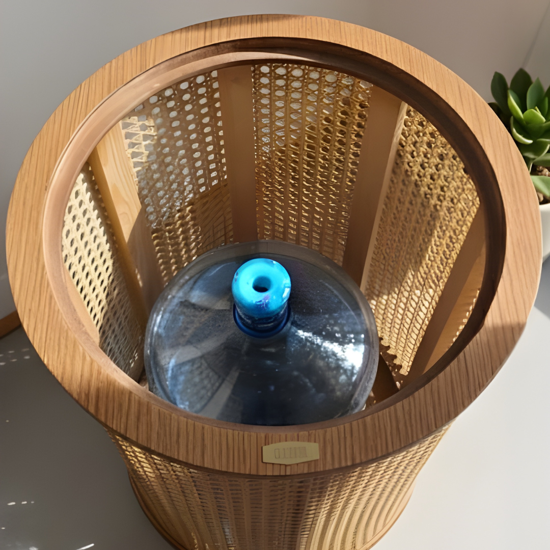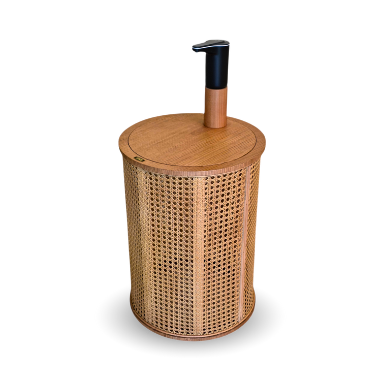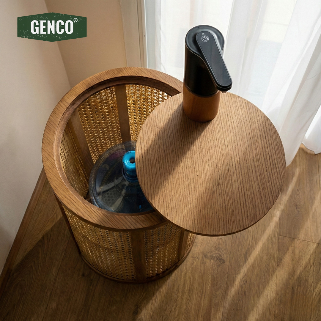 Add a touch of warmth and style with The Boho Coffee Corner. Combining trendy natural Cane with durable MDF, this cylindrical unit is a functional art piece suitable for any living room, waiting area, bedroom, or office. It effectively hides your water bottle while serving as a stylish table, finished with a premium Carved Brass GENCO Logo.