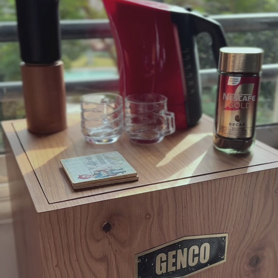 Transform your space with The Cube Coffee Corner, a sleek side table designed to completely hide your water gallon. Crafted from high-quality MDF with our signature Carved Brass GENCO Logo, its sharp geometric design looks perfect in a living room, home office, bedroom, or professional waiting area.